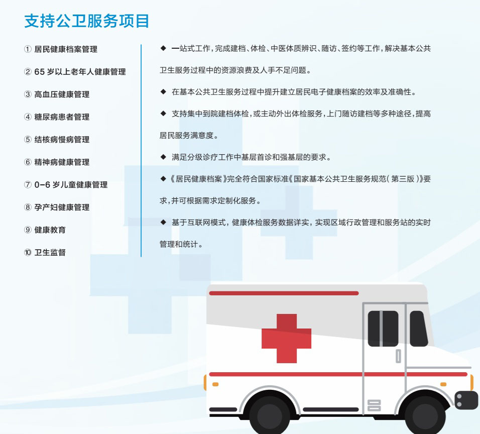支持國家公衛體檢,《居民健康檔案》完全符合國家標準《國家基本公共衛生服務規范(第三版)》要求。
